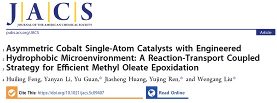 第一项研究成果以“asymmetric cobalt single-atom catalysts with engineered hydrophobic microenvironment: a reaction-transport coupled strategy for efficient methyl oleate epoxidation”为题发表于jacs。该研究针对可再生植物油(如大豆油、菜籽油等)催化转化为高附加值化学品过程中,催化剂活性低、选择性差及传质受限等瓶颈问题,提出了一种“反应-传递耦合”的新策略。团队创新性地设计并合成了一种具有非对称co-n2-o2配位结构的单原子催化剂。理论计算与实验研究表明,与传统的对称co-n4位点相比,这种非对称结构有效调控了中心co原子的电子态,使其d带中心显著上移,从而极大地增强了催化剂对o2分子的本征活化能力。在此基础上,研究团队通过烷基酸酐对催化剂表面进行功能化修饰,构建了疏水性反应微环境。该疏水界面不仅能有效富集亲油性的植物油底物分子,还能形成“富氧表面”,显著提高活性位点局部的o2浓度,从而克服了黏性反应体系中长期存在的传质瓶颈。得益于“反应-传递耦合”的协同增效机制,该催化剂在温和条件下(常压o2)催化油酸甲酯环氧化反应的转换频率(tof)高达1356 h⁻1,选择性大于99%,远超目前已报道的大多数多相催化体系,为生物质资源的高效、绿色转化提供了新思路。全文链接:https://doi.org/10.1021/jacs.5c09407