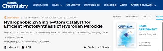 另一项重要成果以“hydrophobic zn single-atom catalyst for efficient photosynthesis of hydrogen peroxide”为题发表于ccs chemistry。该工作聚焦于绿色氧化剂过氧化氢(h2o2)的人工光合成领域,针对传统半导体光催化剂存在产物h2o2易在催化剂表面发生二次分解导致选择性差的难题,提出了一种基于传质强化的“捕获-释放”(capture-release)催化策略。